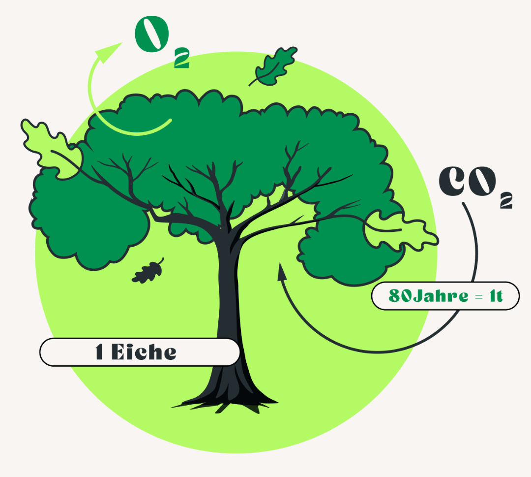 Zum CO₂-Speicher: Das macht der Baum im Holz. In etwa speichert eine Tonne Holz eine Tonne CO₂. Jede*r kennt die Jahrringe des Baums, an denen man abzählen kann, wie alt der Baum ist. Die Jahrringe sind immer ähnlich dick, aber der Umfang wird von Jahr zu Jahr mehr. Daher ist es simple Mathematik, dass der Baum als Setzling wenig und mit steigendem Alter dann immer mehr CO₂ speichert.